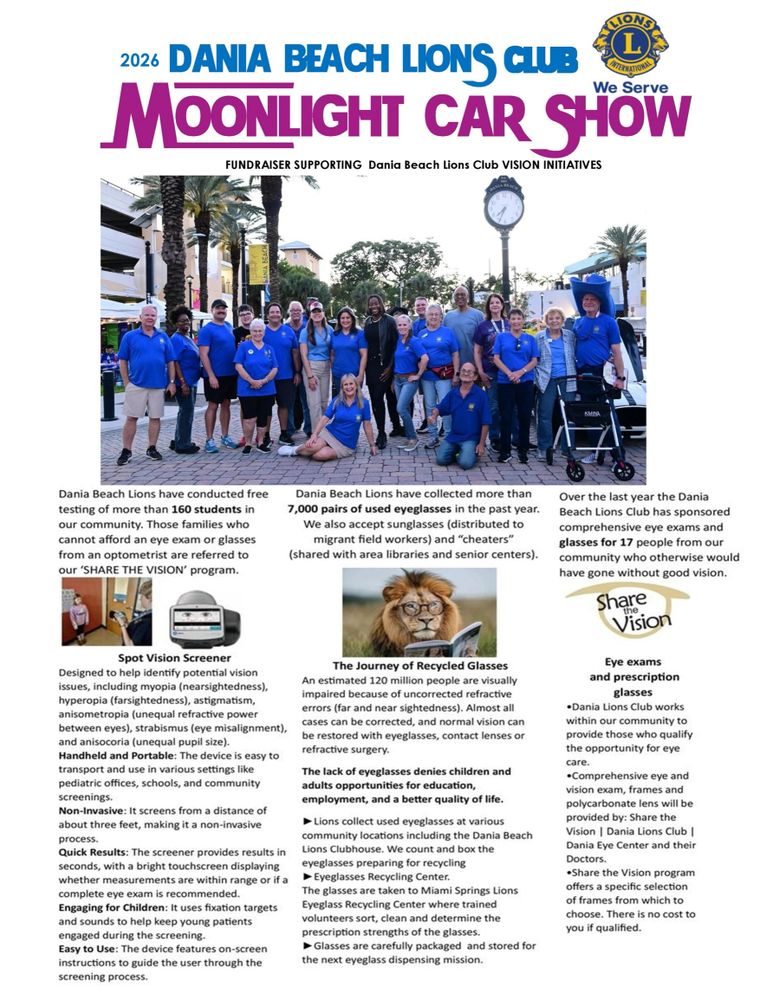 Solicit glasses donations. Gather donations from more than 20 collection sites in our area. Count and prepare glasses donation for delivery to Miami Springs Club for further handling. Continue to solicit and process applications for the Share the Vision exam/eyeglasses program in the community